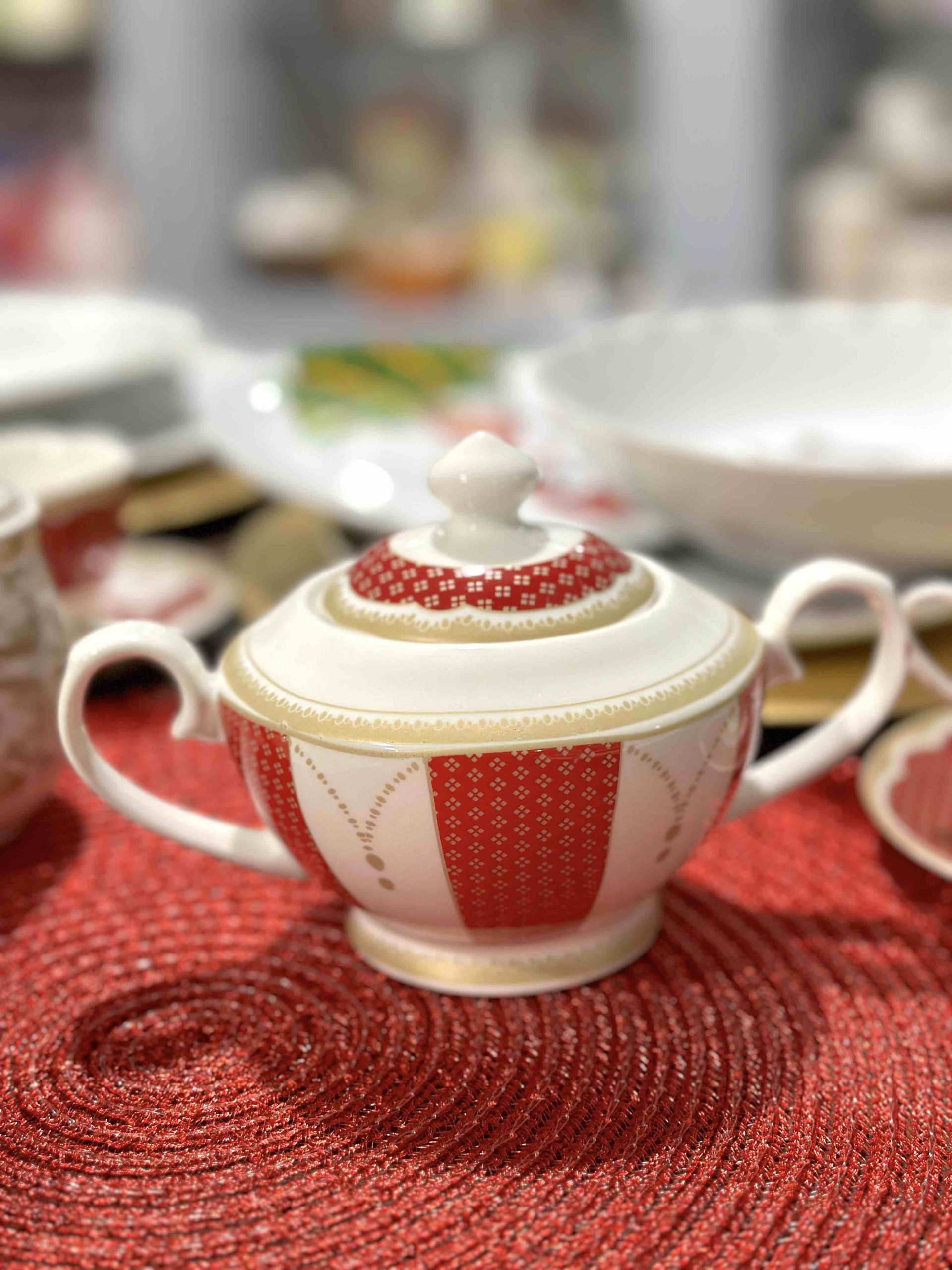 BRANDANI ZUCCHERIERA IN PORCELLANA CON DECORAZIONI ROSSO/ORO