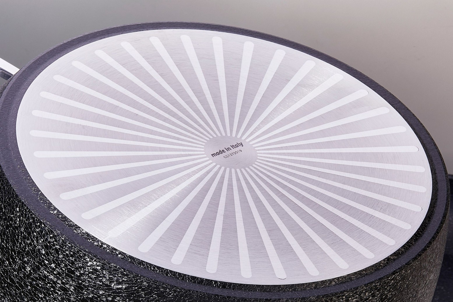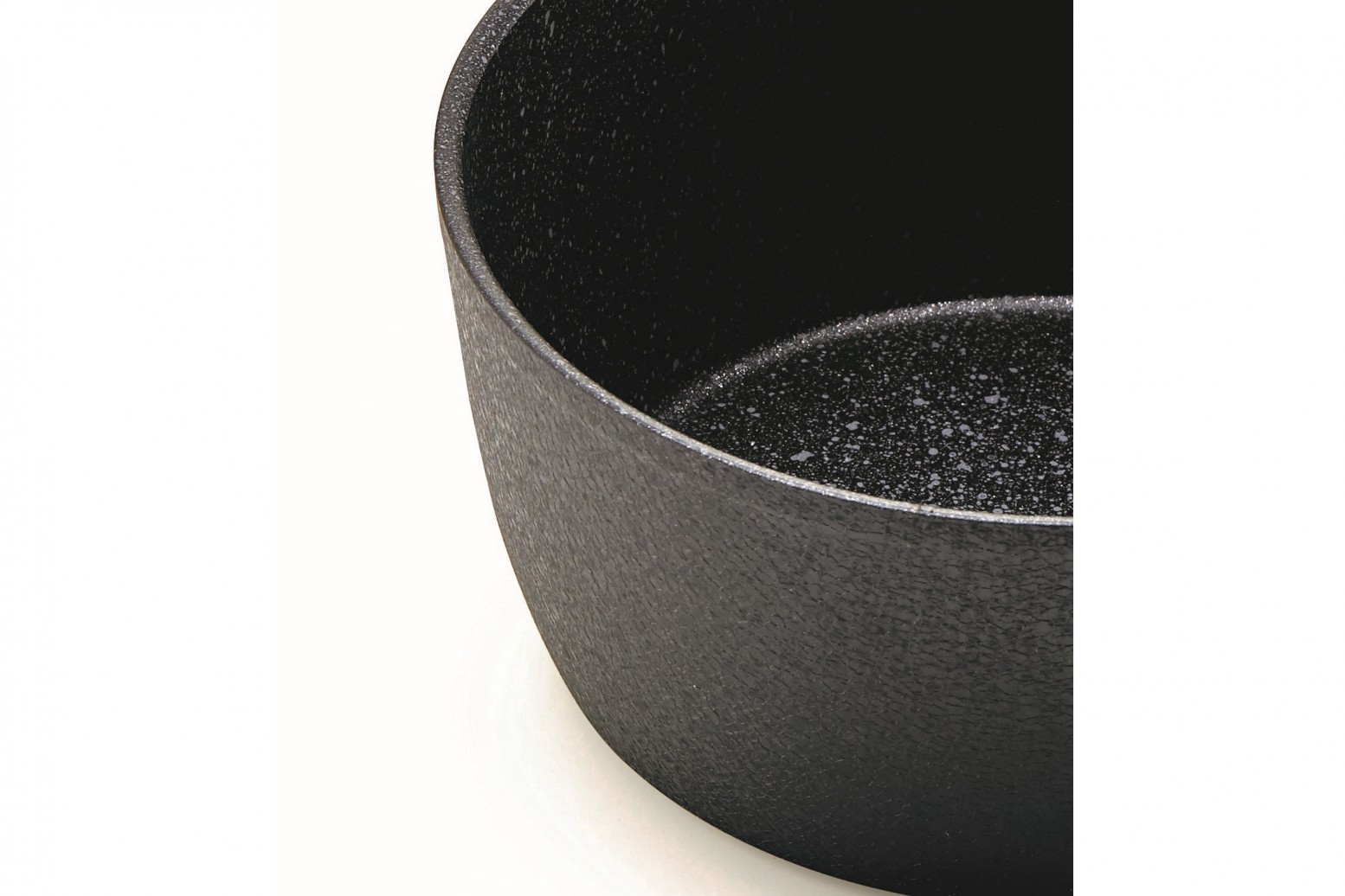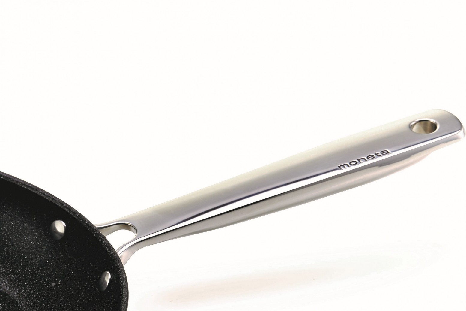 Corpo in alluminio alimentare con fondo induction A, per una omogenea distribuzione del calore. Rivestimento antiaderente effetto pietra Artech Stone ultra rinforzato con particelle minerali. Sicuro per la salute: Moneta utilizza alluminio per uso alimentare e tutti i suoi rivestimenti sono idonei al contatto con i cibi e privi di sostanze pericolose per la salute: no nickel, NO PFOA, no Bisfenolo A. Per tutti i fuochi compresa induzione; lavabile in lavastoviglie. 100% made in Italy.