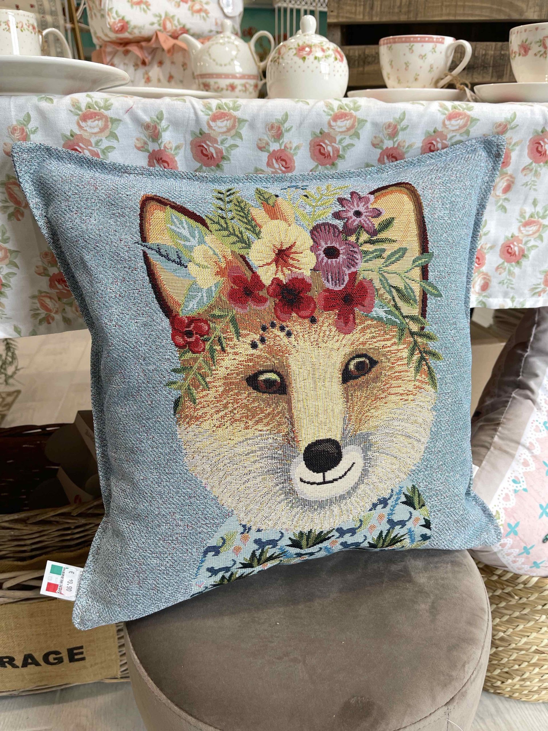 CUSCINO PRIMAVERILE CON VOLPE IN COTONE GOBELIN IMMAGINE FRONTE E RETRO COMPRESO DI IMBOTTITURA