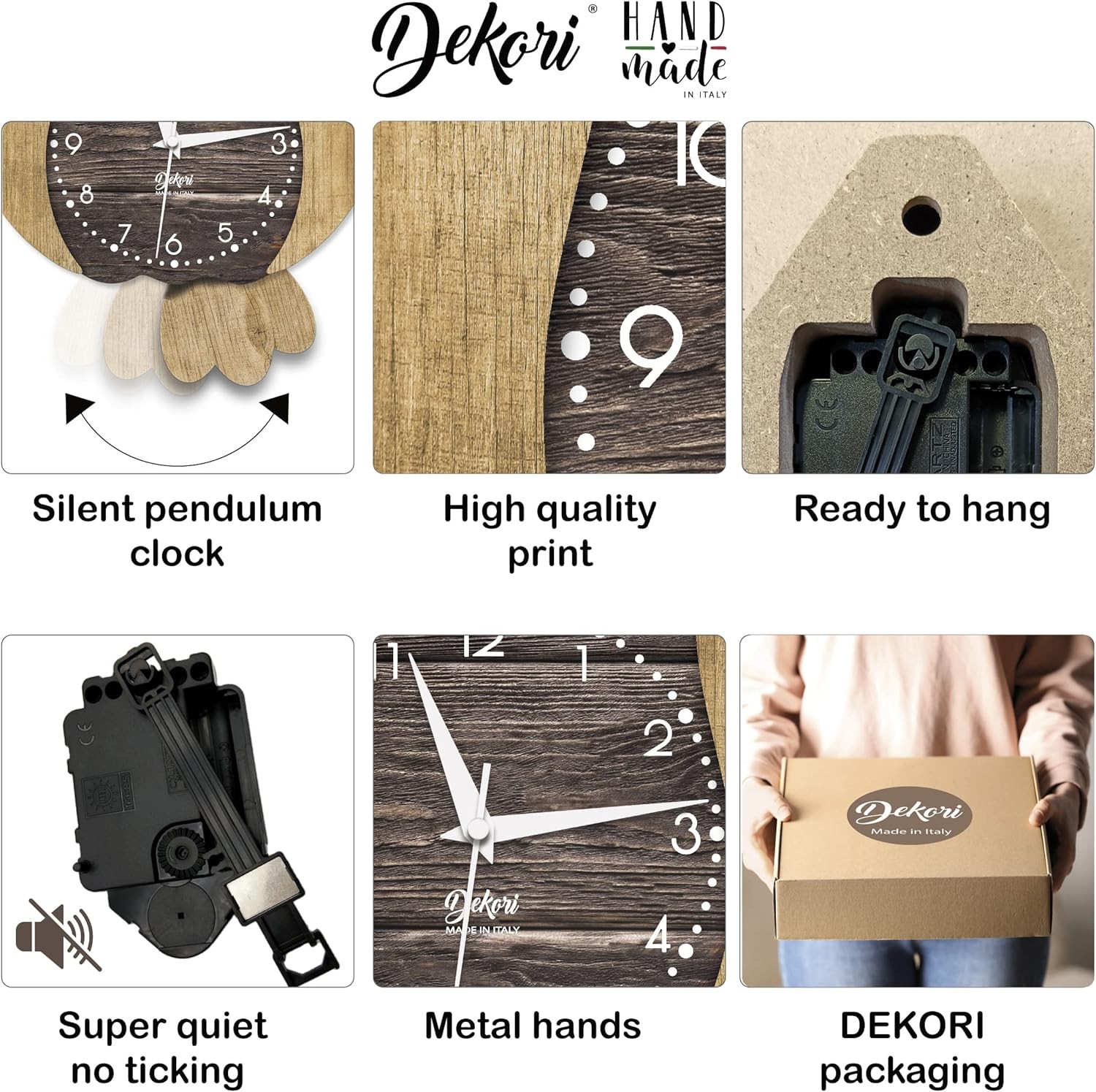 - MATERIALI – L’orologio è realizzato in HDF (fibra di legno molto resistente), rifinito con vernici a basa d’acqua. La stampa, in alta definizione, viene applicata sul legno con inchiostri atossici certificati per gli ambienti domestici. Le lancette sono realizzate in metallo, leggere e resistenti.