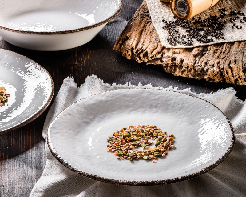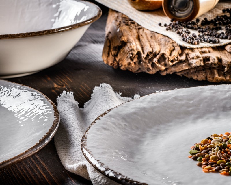Questo procedimento fa si che i piatti non si graffino quando vengono impilati. Il rigo di finitura sul bordo viene effettuato manualmente, ogni piatto quindi è un assoluto pezzo unico!