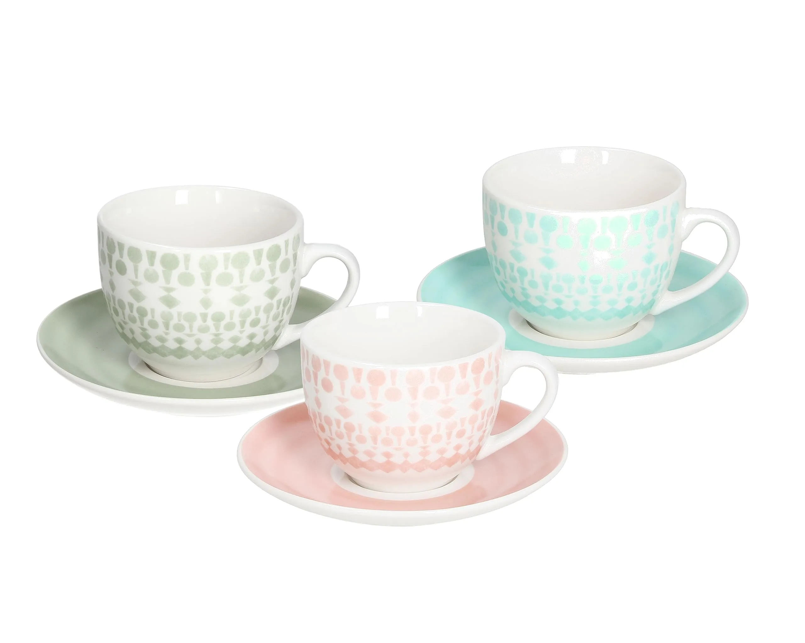 IDEALI COME REGALO PER LA VOSTRA PUASA THE’ IN COMPAGNIA, PROPONIAMO BELLISSIMO SET COMPOSTO DA 6 TAZZE CON PIATTINO. DUE TAZZE PER COLORE