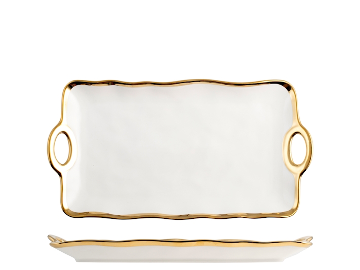 Vassoio con manici gala in porcellana bianca con bordo oro cm 23,5×45. non idoneo al lavaggio in lavastoviglie e all’uso in forno a microonde.
